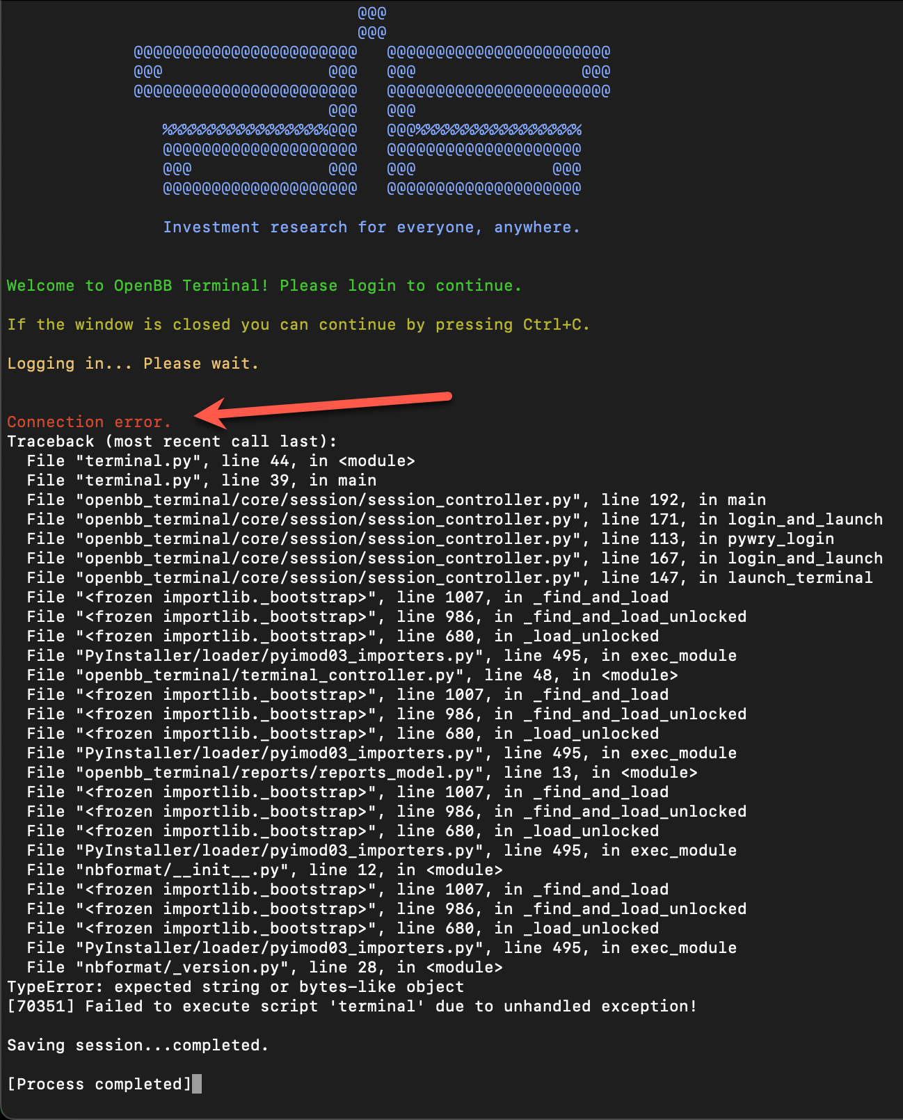 Running OpenBB Terminal on macOS? Struggling with SSL Certificate verify issues? It’s possible that there is an upstream device that’s performing some sort of SSL/TLS decryption (like a corporate decryption/security service?). Unfortunately there is not good error reporting on this: